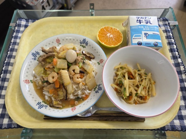 献立:中華丼、しゃきしゃき芋ナムル、みかん、牛乳です。