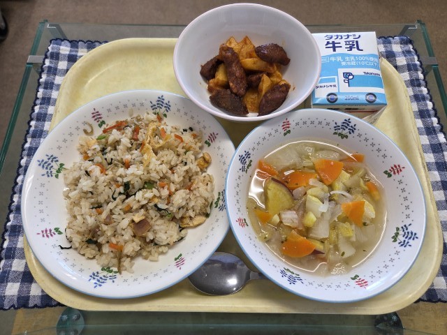 献立:じゃことベーコンのピラフ、レバーとポテトのマリアナソースがらめ、さつまいもと白菜のスープ、牛乳です。