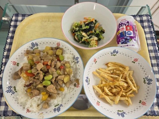 献立:コロコロ根菜ガパオライス、じゃがあげカレー風味、こまツナレモンサラダ、ジョアです。