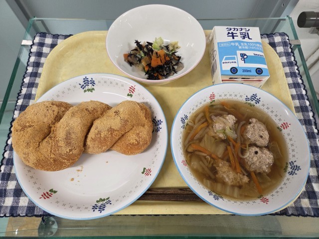 献立:きなこパン、肉団子と春雨のスープ、れんこんひじきサラダ、牛乳です。