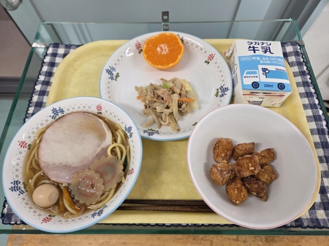 献立:ポニョのラーメン、かじきの竜田揚げ、ツナごぼうサラダ、みかん、牛乳です。