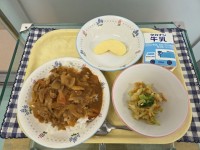 献立:プルコギ丼、バンサンスー、紅まどんな、牛乳です。