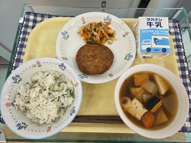 献立:じゃこ入り菜飯、おびてん、切り干し大根のまだか漬け、ざぶ汁、牛乳です。