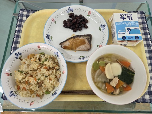 献立:こぎつねごはん、ぶりの照り焼き、黒豆、白玉雑煮、牛乳です。