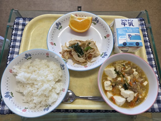 献立:ごはん、塩マーボー豆腐、小松菜と春雨のナムル、いよかん、牛乳です。