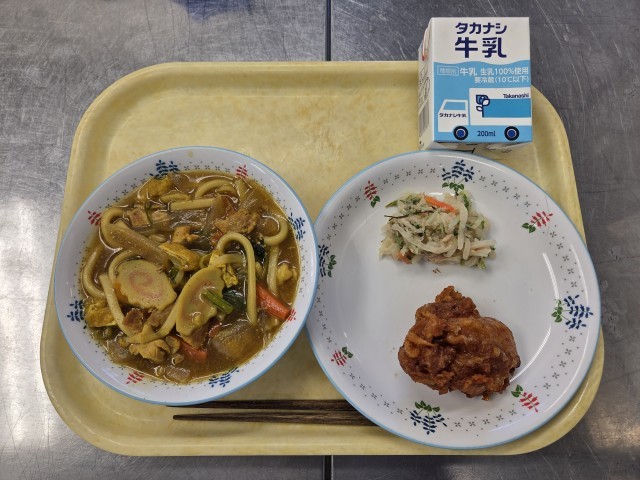 献立:カレーうどん、とり天、大根のツナマヨサラダ、牛乳です。