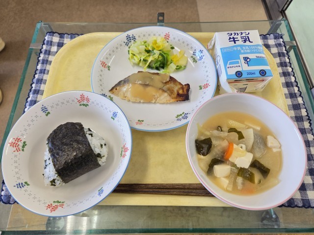 献立:わかめおにぎり、銀さわらの西京焼き、豆腐とわかめのみそ汁、即席漬け、牛乳です。