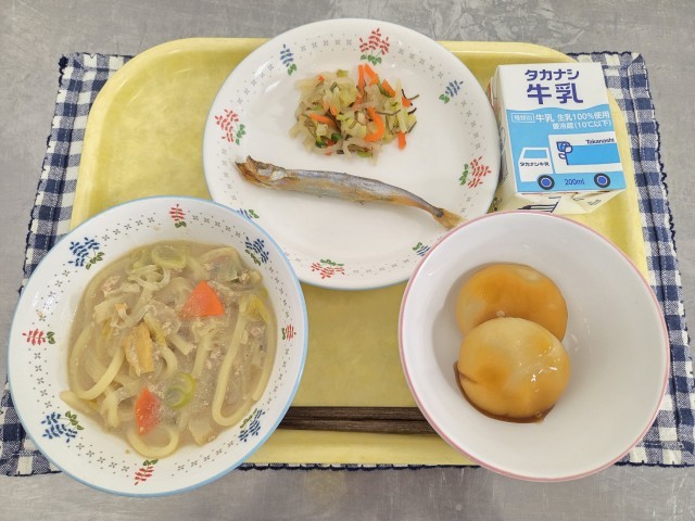 献立:白ごまたんたんうどん、焼きししゃも、野菜の昆布和え、みたらし団子、牛乳です。