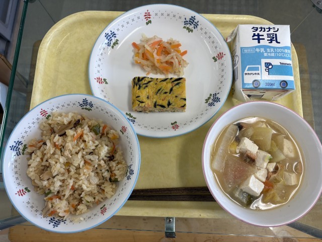 献立:高野豆腐のそぼろごはん、たまご焼き、石狩汁、大根の甘酢漬け、牛乳です。