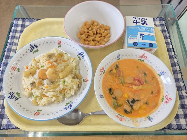 献立:シーフードピラフ、トマトと豆乳のパスタスープ、スパイシービーンズ、牛乳です。