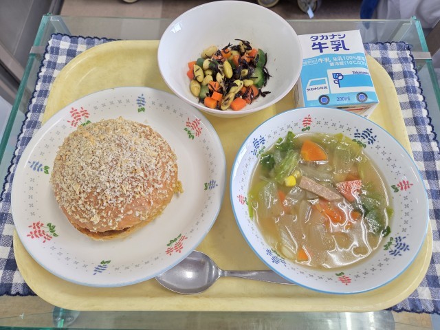 献立:焼きカレーパン、ハムとレタスのスープ、青大豆とひじきのサラダ、牛乳です。