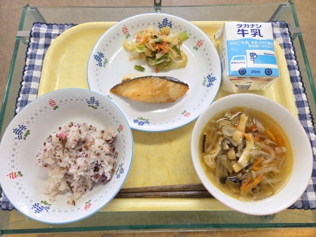 献立:桜おこわ、鰆の照り焼き、おかか和え、沢煮椀、牛乳です。