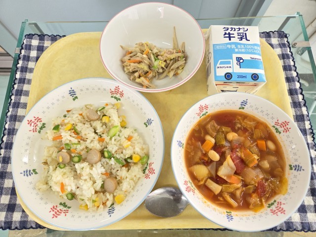 献立:アスパラピラフ、新ごぼうのツナサラダ、ミネストローネ、牛乳です。