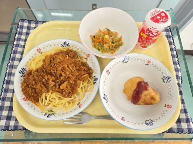 献立:スパゲッティミートソース、新じゃがのポテトドッグ、元気サラダ、ジョアです。