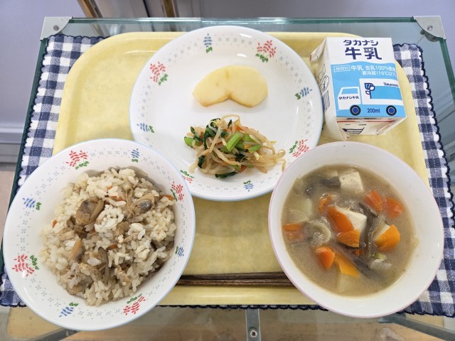 献立:深川めし、からし和え、豚汁、りんご、牛乳です。