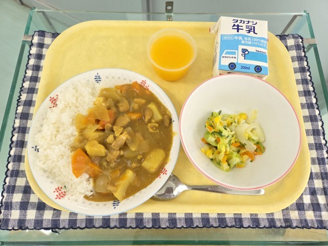 献立:チキンカレーライス、コーンサラダ、みかんゼリー、牛乳です。