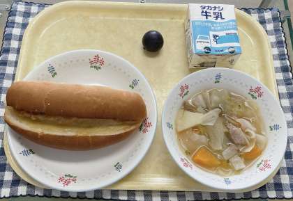 献立:ビーンズチーズドック、ポトフ、ぶどう、牛乳です。