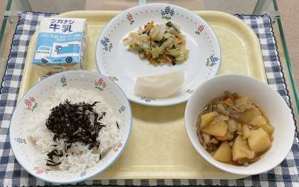 献立:ひじきふりかけご飯、肉じゃが、3色おひたし、梨、牛乳です。