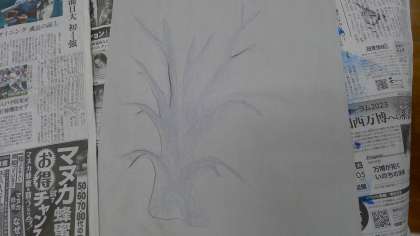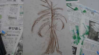 木を描いてそれを切り取って貼ることで森のような風景を作っていました。