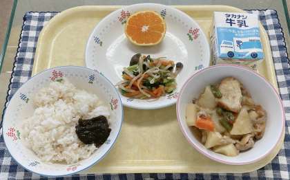 献立:玄米ご飯、のりの佃煮、ゆず塩肉じゃが、きのこと野菜の和え物、みかん、牛乳です。