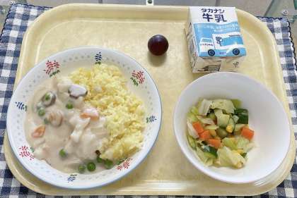 献立:ターメリックライスシーフードソースかけ、コーンサラダ、ぶどう、牛乳です。