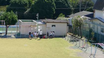 「光」の学習の導入で校庭で鏡を使って光を反射させていました。