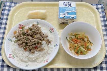 献立:ガパオライス、パリパリサラダ、りんご、牛乳です。