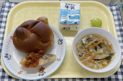 献立:黒糖パン、魚のエスカベッシュソース、ビーフンスープ、マスカット、牛乳です。