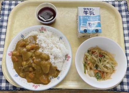 献立:カレーライス、春雨と野菜のサラダ、ぶそうゼリー、牛乳です。
