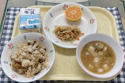 献立:さんまごはん、なめこ汁、はりはり漬け、みかん、牛乳です。