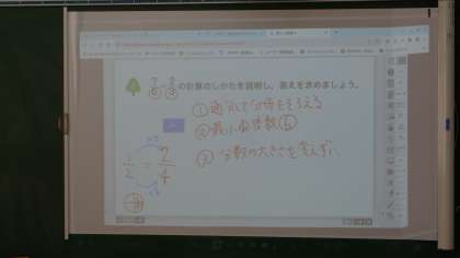 分数のたし算引き算について復習した後プリントで練習を行っていました。