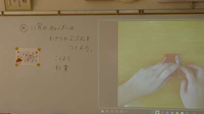 11月のカレンダーの飾りの部分を折り紙を使って作っていました。
