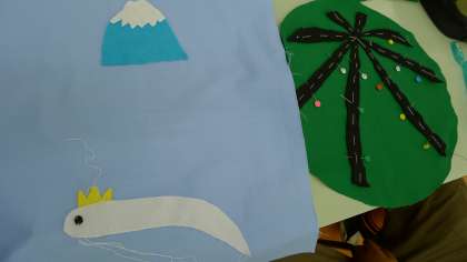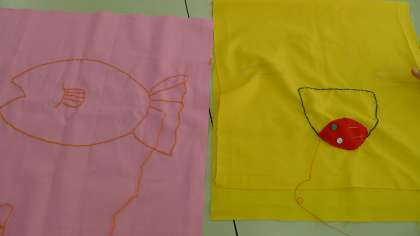 本返し縫いなどの技法を使ってクッションの模様を縫っていました。