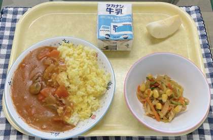 献立:ターメリックライス、ポークストロガノフ、大根サラダ、りんご、牛乳です。