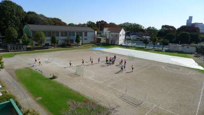 校庭でハンドボールのような競技を行っていました。