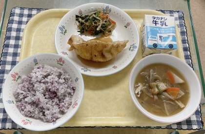 献立:ゆかりごはん、ジャンボギョーザ、野菜ごまあえ、根菜汁、牛乳です。