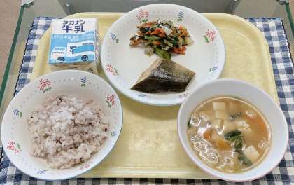 献立:十六穀米ご飯、ほっけのみりん焼き、磯かあえ、呉汁、牛乳です。