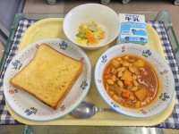 献立:ポンデケージョ、チキンビーンズ、ごぼうサラダ、牛乳です。