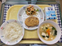 献立:ごはん、ハンバーグ、カラフルサラダ、コンソメスープ、牛乳です。