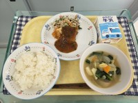 献立:わかめごはん、ジャンボぎょうざ、こまつなとひじきのナムル、五目スープ、牛乳...