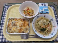 献立:チーズチキンドリア、カラフルサラダ、パスタスープ、牛乳です。
