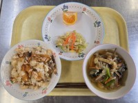 献立:にしんごはん、沢煮椀、野菜のみそドレッシングサラダ、はれひめ、牛乳です。
