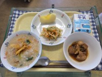 献立:中華風がゆ、豚の角煮、しゃきしゃきいもナムル、りんご、牛乳です。