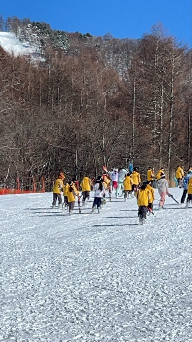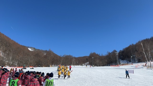 冬晴れの澄んだ空気の中、ゲレンデで子供たちが各々のコースに分かれて滑り出します。