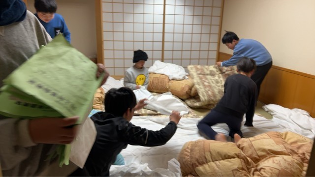 検温を終え、保健係が職員に報告したり、担当の係を中心に、全員で布団の片付けや荷物の片付け、整理を行ってます。