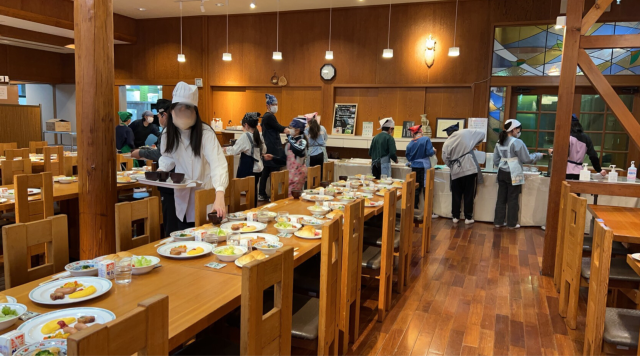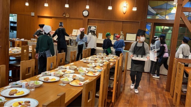 食事係の仕事も始まりました。片付け・掃除・朝食用意と様々な仕事が同時進行で進んでいます。みんな、テキパキ行動しています。
