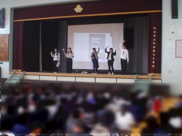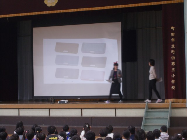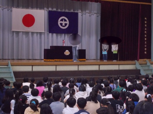 生活指導から春休みの生活についての劇がありました。学校生活パンフレットも