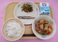 全国学校給食週間2日目は、1950年頃の給食メニューのコロッケとクリームスープです。当時、ご飯ではなくパンでした。おかずにはコロッケやクリームスープなどが出たようです。今日のコロッケには大豆を、クリームスープにはブロッコリーやかぶ、さつまいもといった冬野菜を入れて栄養価をアップさせました。