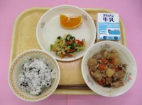 献立は「チキンカレーライス・元気サラダ・ぶどうゼリー・牛乳」でした。鳥肉を使ったカレーライスでしたが、ゆでた大豆を加えてたんぱく質やビタミンB1をアップさせました。苦手な子が多い大豆ですが、カレーなら食べてくれました。また、サラダには今日も学校農園でとれたブロッコリーが登場しました。