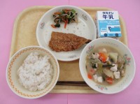 献立は「炊込みご飯・魚のピリカラソース・かぶとキャベツの昆布和え・みそ汁・牛乳」でした。かぶは今が旬で、食物繊維やカルシウム、ビタミンCがとれます。キャベツとともに、昆布とあえて漬物のようにしました。